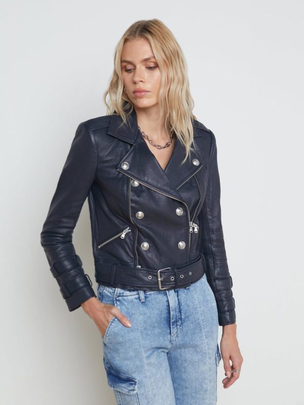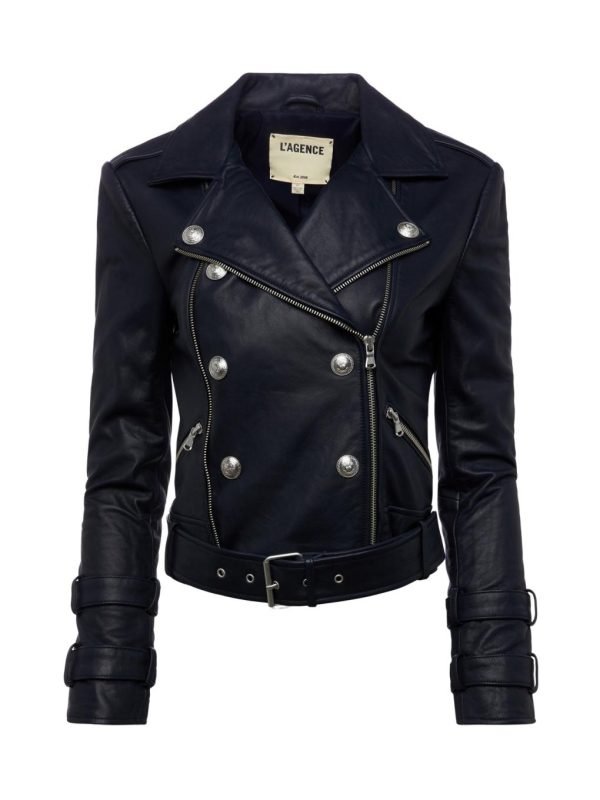 Elevate your style with this sophisticated biker-inspired leather jacket featuring premium embossed silvertone buttons. This statement piece combines authentic edge with modern elegance through its adjustable leather belt, secure zipper pockets and trim, customizable sleeve straps, and substantial buckle-accented belt. Expertly crafted with complete lining for superior comfort. 100% Lambskin.