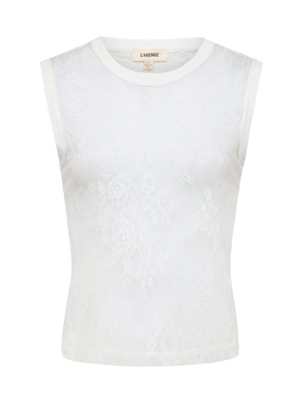 A sheer lace muscle tank, featuring a floral pattern and solid ribbed trim. Lightweight and versatile—wear it solo or layered under your favorite jacket.