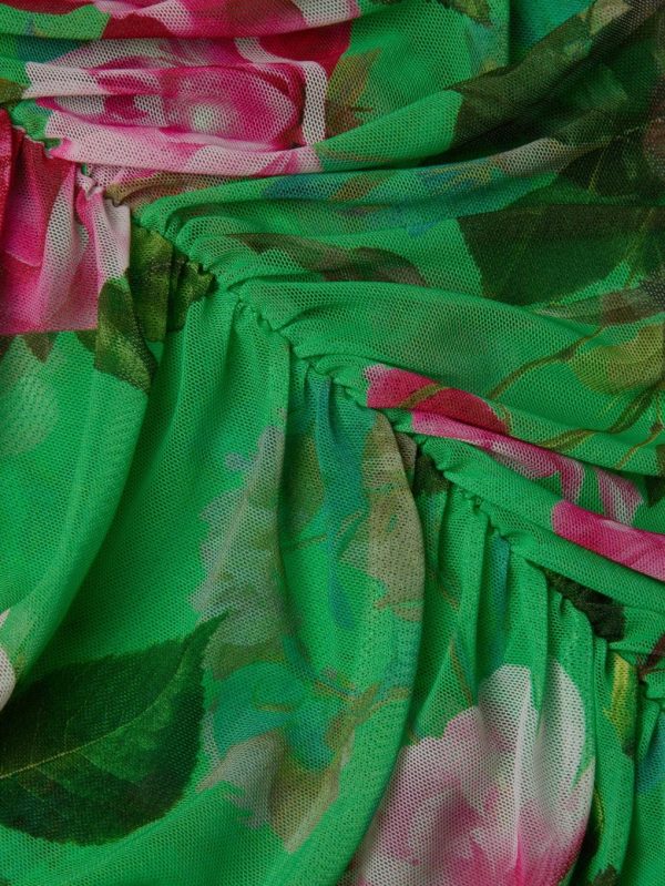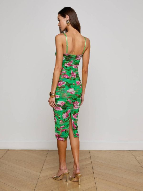 This midi dress is your reason to RSVP yes. Allover ruching and removable straps that make Caprice your most figure-flattering option for every event. Now in green with a romantic rose print.
