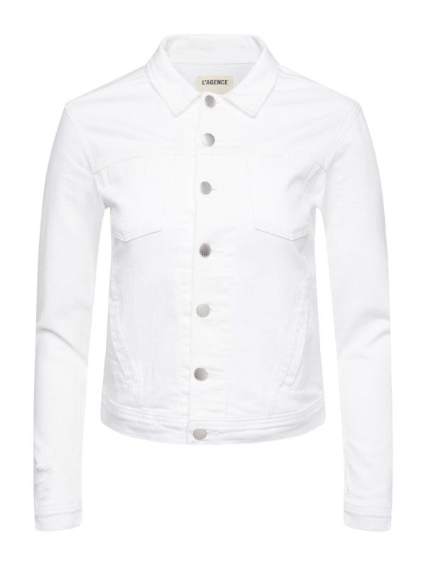 Discover this beautifully distressed classic denim jacket featuring a comfortable relaxed fit in crisp optic white. Expertly crafted from premium stretch denim that maintains that authentic denim feel you love. The Celine design showcases a delicate feminine collar, flattering angled seams, functional slit pockets, and a polished finished hemline for a sophisticated look.
