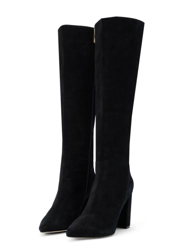 The quintessential knee-high pointed-toe boot in black suede. Impeccably crafted suede molds to flatter the foot and calf in an elegant, timeless silhouette. Wearable block high heel is ultra-versatile, pairing effortlessly with denim, leggings or skirts. Zip closure. 100% Suede.
