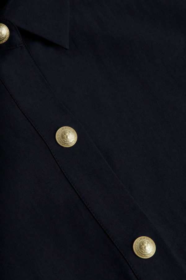 A classic tailored shirt with a cool, borrowed-from-the-boys fit and miniature embossed dome buttons for a touch of glamour. Now in black and gold.