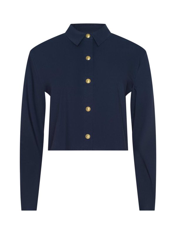 A classic tailored shirt with a cool, borrowed-from-the-boys fit and miniature embossed dome buttons for a touch of glamour. Now in midnight.
