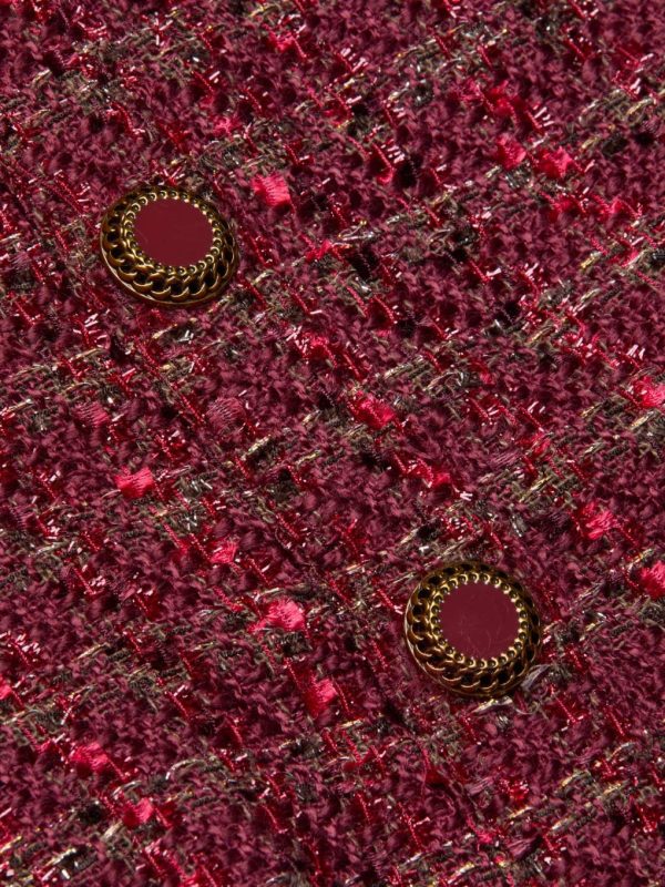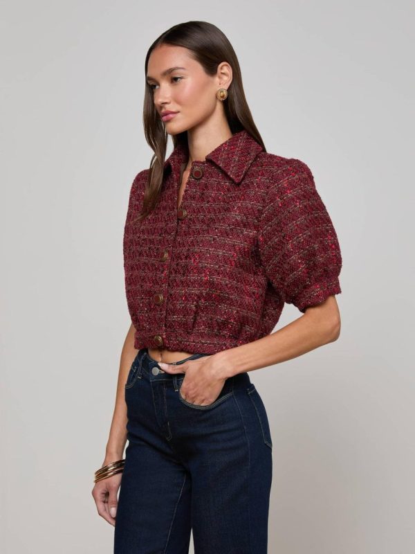 With an ultra-feminine cropped silhouette and puff sleeve, our cropped Cove works double duty as a chic jacket or top. Now back in a black cherry textured tweed with threads of red and brown, finished with vintage-inspired buttons.