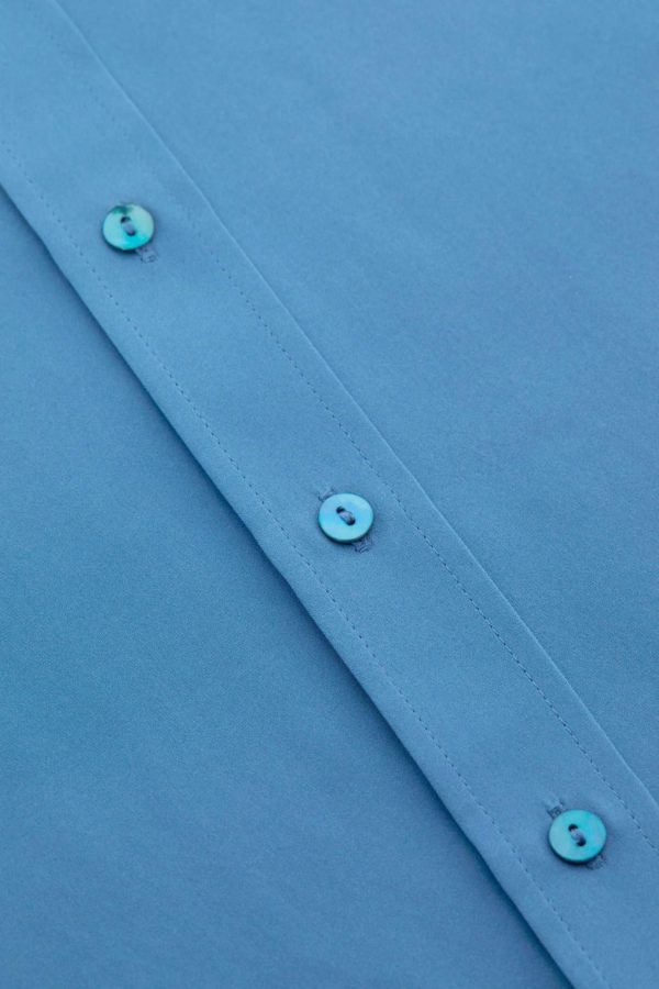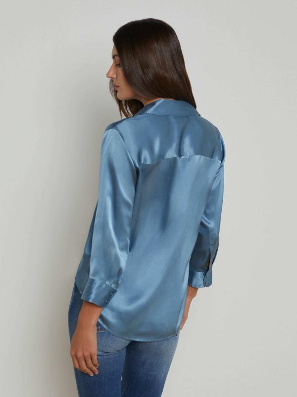 Discover the essential silk button-down that elevates every sophisticated wardrobe. Our signature three-quarter sleeve shirt returns in a beautiful blue mist hue that complements any ensemble.