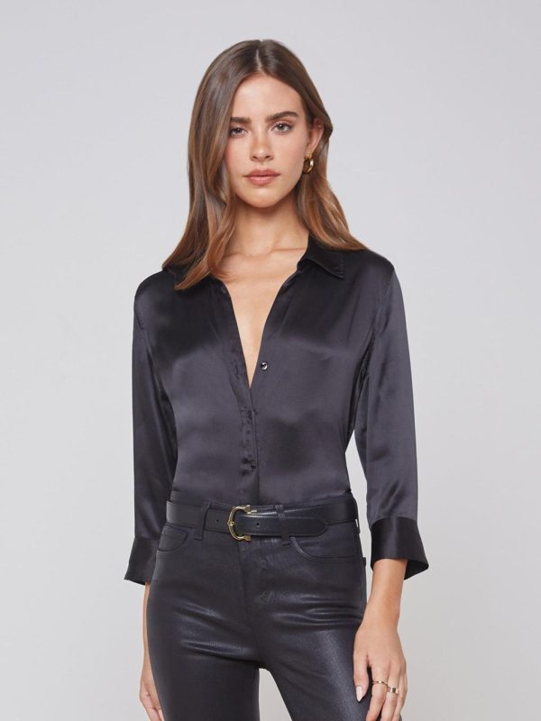 A classic button-down blouse with a luxurious, light catching luster. Black charmeuse silk drapes effortlessly to a shorter, curved hem. Three-quarter-length sleeves and a relaxed open collar balance elegance with wearability. 100% silk.