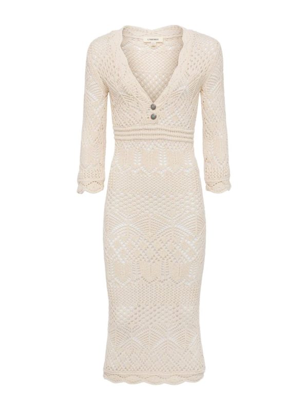 Beach days, evenings on the yacht, seaside cocktails–the Dovie knit dress is your answer to every activity near sand and saltwater. Featuring a deep V-neck and scalloped trims, it’s perfect as a flattering cover-up or layered over tonal pieces.
