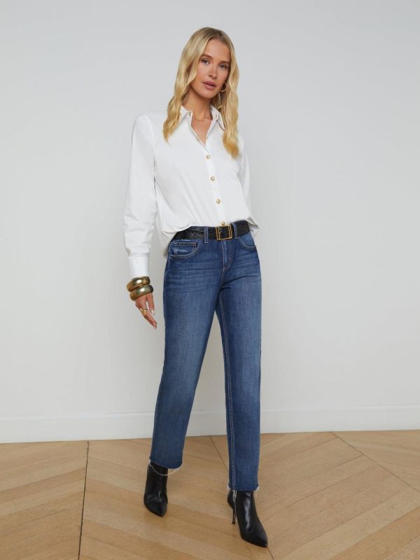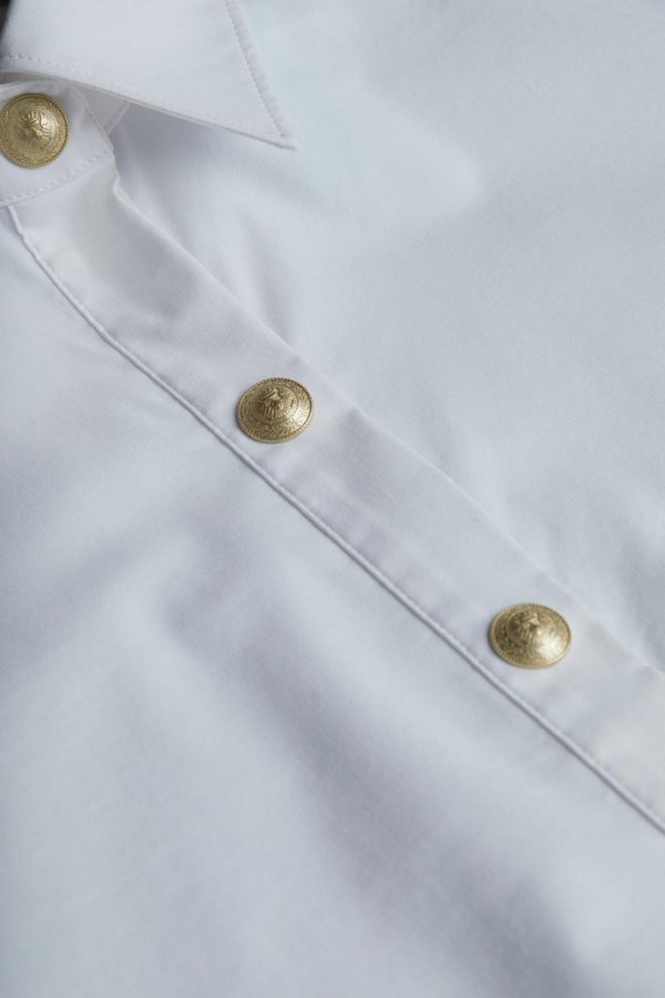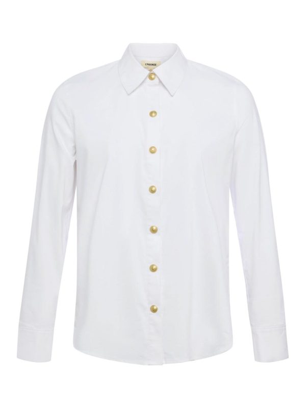 Elevate your wardrobe with our reimagined classic white shirt featuring sophisticated gold buttons that add a touch of luxury. Crafted from crisp stretch poplin with an effortlessly relaxed fit, the Ellery blouse becomes your year-round staple piece.