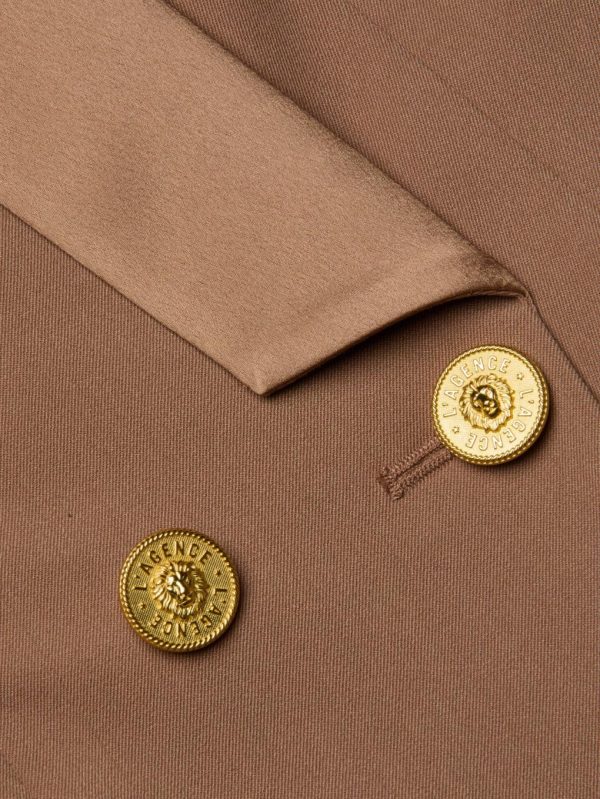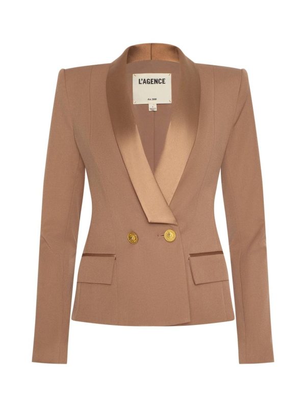 A sharp, timeless double-breasted blazer accented with a lustrous satin lapel. Now in a neutral tan.