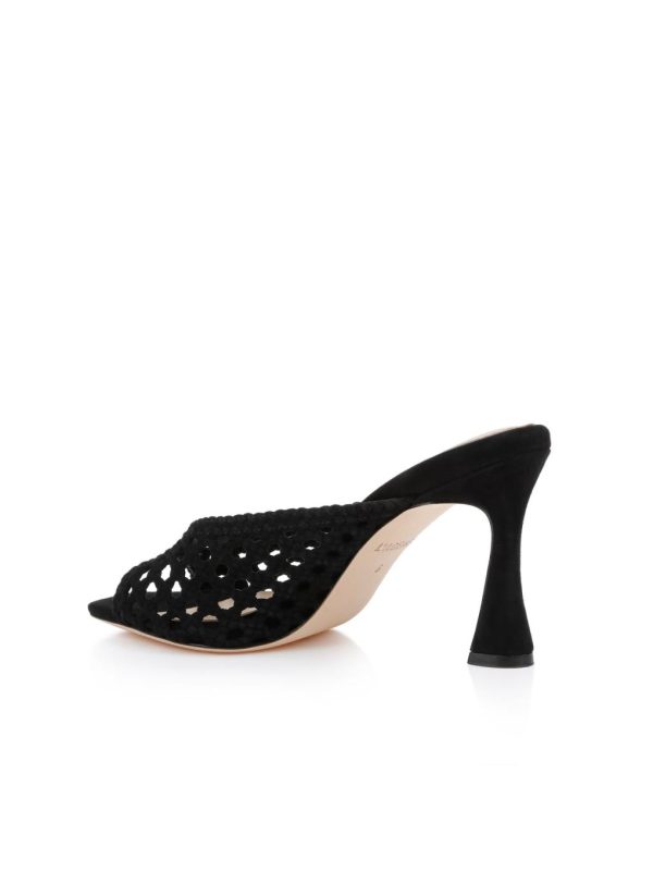 Elevate your evening style with the Jacques mule, featuring a luxurious woven suede upper and a striking sculptural flared heel. The sophisticated V-cut vamp creates a beautifully elongating silhouette that complements any outfit. Crafted in rich black suede.