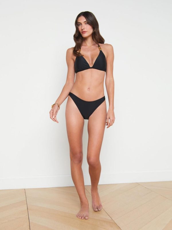 Our high-leg bikini bottom, in timeless black. Jean sits at the hip, beautifully elongating the legs. In a four-way stretch nylon design with full coverage, she offers secure freedom of movement. Pair with the coordinating Annabelle top for chic poolside style.
