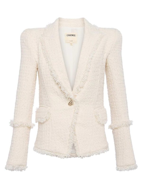 This style debuted at our Spring ’25 NYFW presentation. The Kaisley offers a flattering cinched fit tailored from waffle tweed and finished with gold and silver novelty buttons along the cuffs.