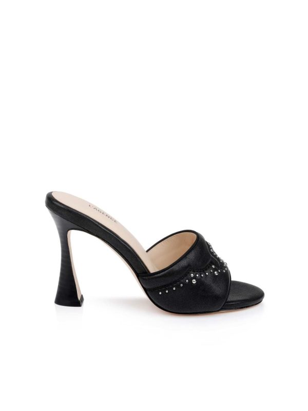 A sophisticated new take on the Western trend. Our signature open-toe heel gets a ranch-inspired spin with stud accents on the vamp. Now in black leather.