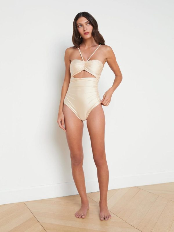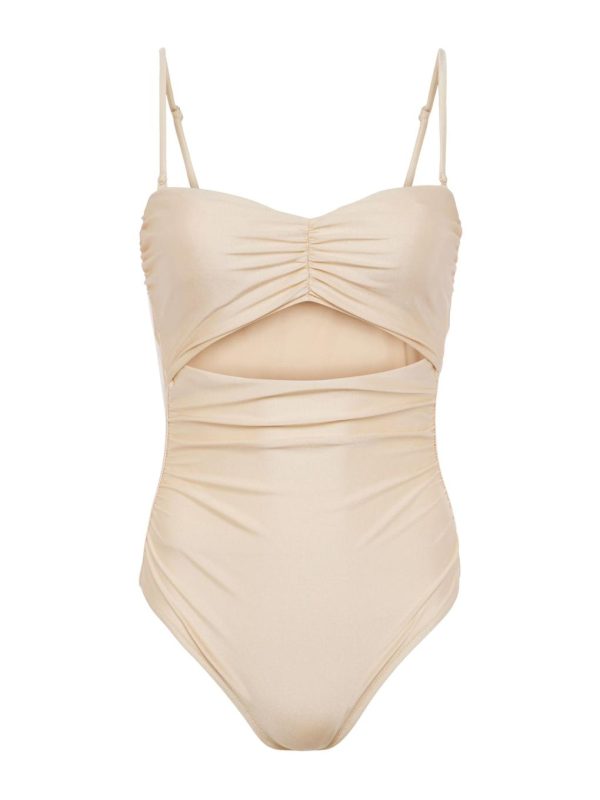 A peekaboo cutout puts an alluring spin on the Lily one-piece swimsuit, now in a versatile neutral . Detachable straps can be attached at the shoulders for a traditional look or at the center front for a halter-like effect. A ruched bodice creates a beautiful sweetheart neckline. Front ruching creates a flattering fit. Four-way stretch nylon and moderate coverage allow for complete freedom of movement.