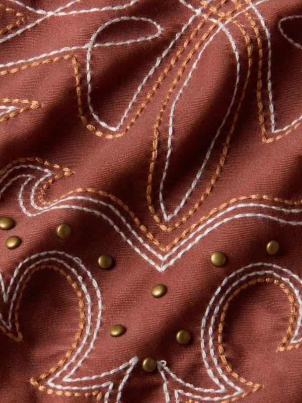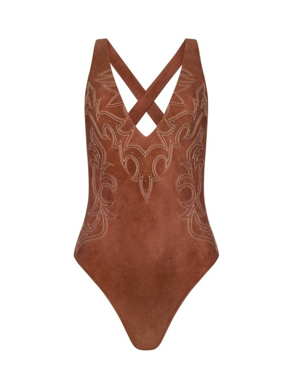 A deep, plunge neckline and Western-inspired embroidery with tiny stud accents make the Lisa a standout. A suede-look finish adds additional visual intrigue.