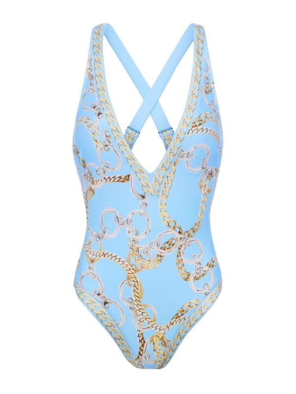 A deep, plunge neckline brings ultra flattering definition to the Lisa one-piece swimsuit. Now in sky blue with our signature chain print.