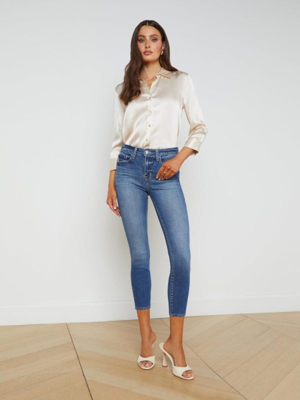 The Margot high-rise skinny jean in a faded blue premium stretch denim that includes REPREVE, a sustainable, high-performance recycled fiber. Contoured waistband and tapered leg hug from waist to ankle, defining and slimming the silhouette. Meticulous whiskering and hand-sanding on hip, seat, and thigh. Classic five-pocket construction and a front zip fly closure.