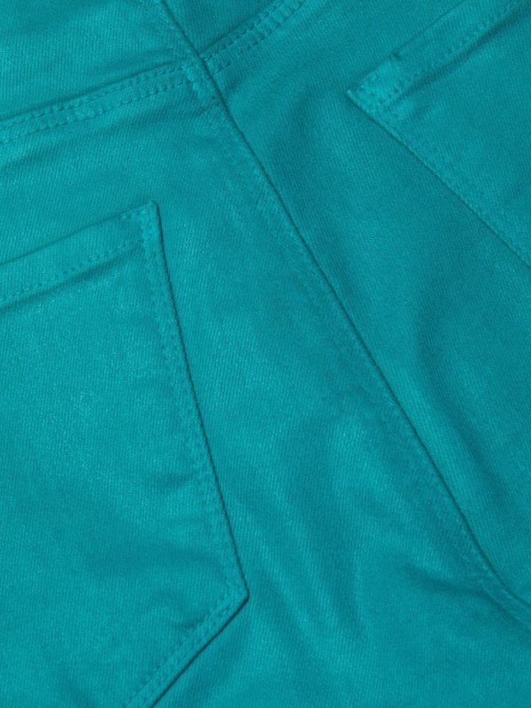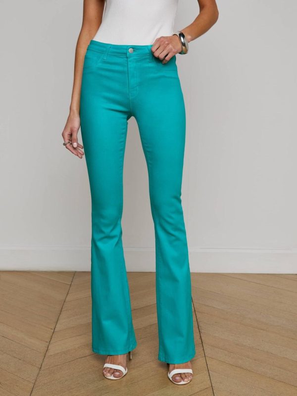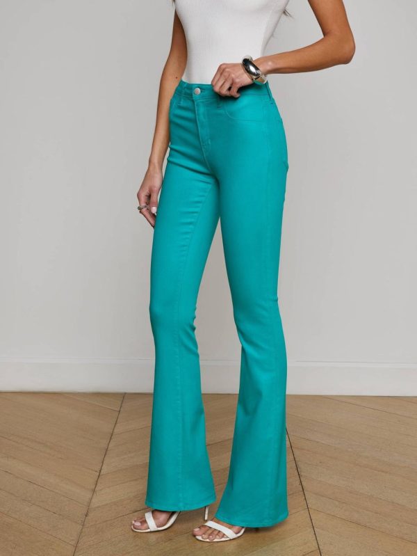 A perfectly proportioned fit in a modern fabrication. The Marty flare jean is now back in a vibrant teal shade of our leather alternative coated denim.