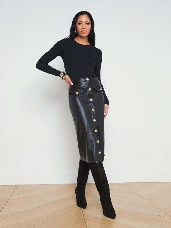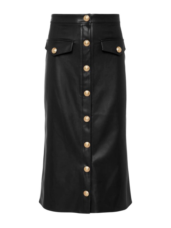 A sleek silhouette and luxe gold accent buttons define our Milann vegan leather skirt. The pencil skirt silhouette hugs the waist before draping straight to the midi hem. The embossed-dome button convert to functional snaps at the hem, letting you create a front-slit look. Wear with a minimalist top and pointed-toe boot to let the skirt take center stage.