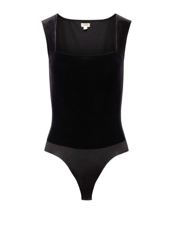 A sleek tank bodysuit in true black. Front square-neck style frames collarbones beautifully. Luxurious stretch velvet hugs curves before extending into a cheeky laser-cut panty that fastens with a two-snap gusset, creating a smooth, line-free look. Sophisticated on its own, it also makes a perfect layering piece under a jacket.