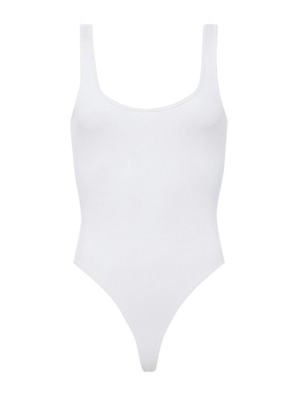 A super-sexy scoopneck bodysuit in pure white. Double scoopneck design in a silky soft premium ribbed knit hugs the figure beautifully, from top to bottom. Cheeky silhouette fastens with a two-snap gusset, creating a smooth, line-free look.
