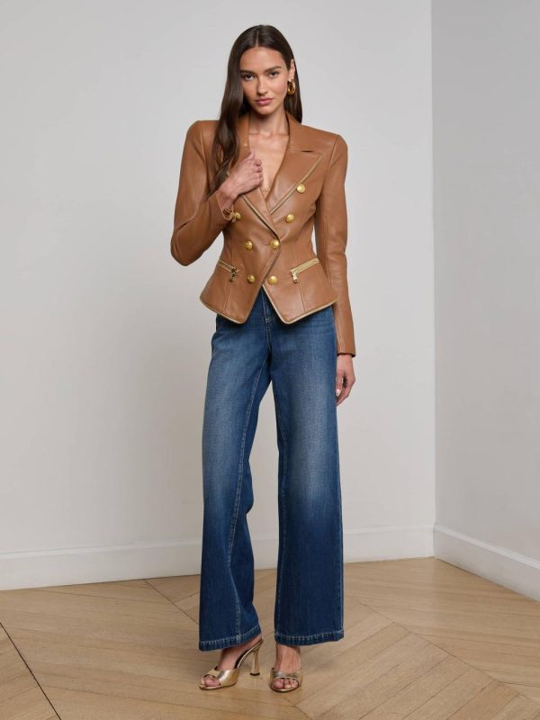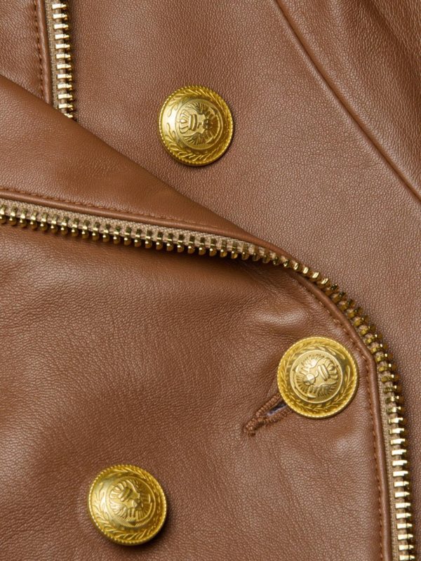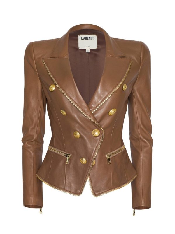 Sculpted and striking, the Ottilie leather blazer in soft cognac is the definition of power dressing. Gleaming gold-tone buttons and exposed zips infuse it with edge, while precision tailoring contours the waist for a sharp, hourglass silhouette. It’s part statement, part armor, and it’s made to turn heads.