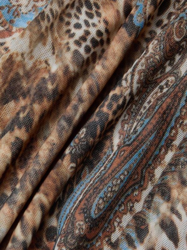 Discover this effortlessly chic off-the-shoulder bodysuit featuring lightweight stretch mesh that delivers a flawless second-skin fit. Perfect for transitioning from daytime elegance to evening sophistication, now available in an exclusive leopard-meets-paisley pattern.