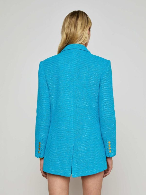 Elevate your wardrobe with this effortlessly chic and versatile knit blazer. The Riva blazer showcases a contemporary oversized silhouette crafted from premium Italian knit fabric enhanced with delicate lurex threading for a sophisticated shimmer. Available in a stunning blue teal hue that complements any complexion.