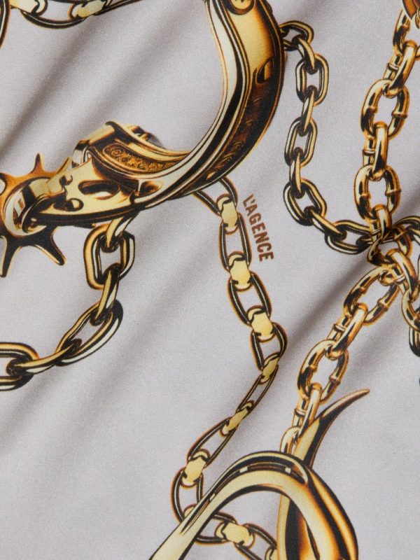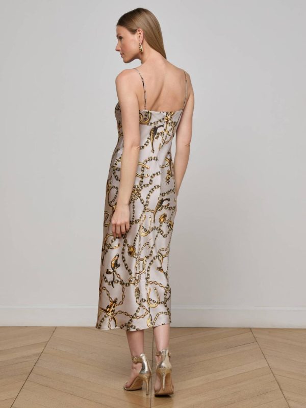 The iconic silk slip dress, offered in new colorways and prints each season. Now back in our gold horn and chain print.