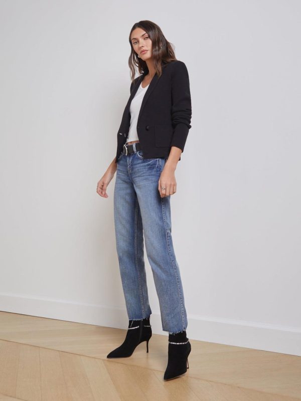 Discover the perfect blend of sophistication and comfort with this double-breasted blazer crafted from premium black knit fabric. Expertly tailored to create a flattering silhouette that tapers at the waist, this versatile piece combines feminine elegance with polished structure. The design features sharp, defined shoulders, contemporary lapels, and practical patch pockets for both style and functionality. Luxe embossed-dome buttons provide an elevated finishing touch that elevates any outfit from day to night.