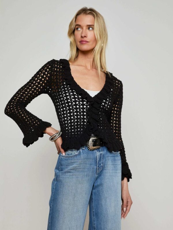 Experience summer elegance in every stitch. The Solaris crochet cardigan features a beautifully open-knit design with delicate ruffled trims that add feminine charm. This timeless black piece offers the perfect lightweight layering solution you’ll reach for season after season. Style it effortlessly over swimwear for beach days or pair with your favorite camisole and denim shorts for casual outings.