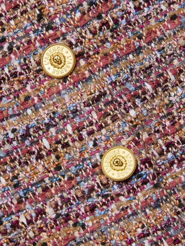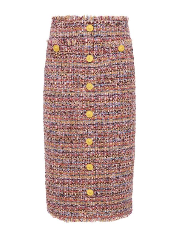 A classic pencil skirt reimagined colorful tweed. Finished with gold buttons and a delicate fringe trim, the Tai channels timeless polish with a playful twist.