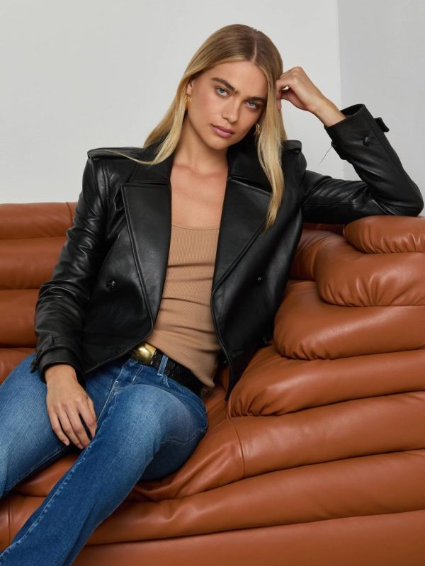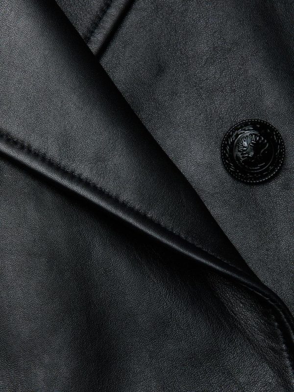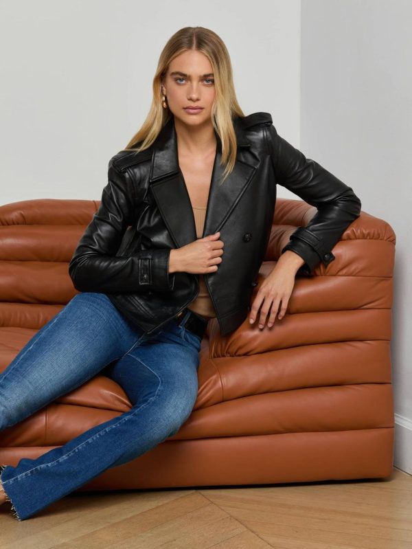 A sleek double-breasted leather jacket with structured shoulders and a cropped silhouette. Crafted from supple, fine-grain black leather with a cool, relaxed fit, the Xoey trench coat brings timeless edge and polish to any look.