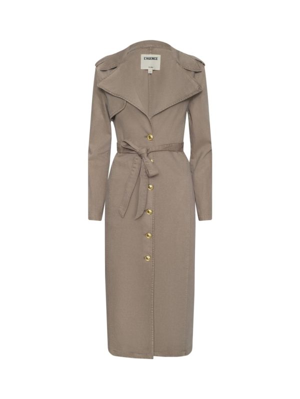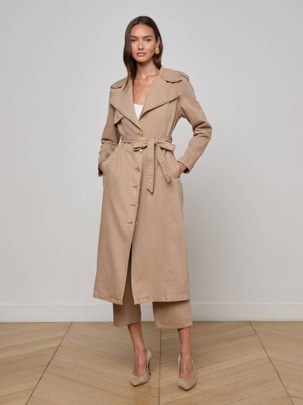 The must-have trench of the season. Introducing the Zavia, a refined denim trench constructed with an oversized collar and lapels, epaulets, and lightly padded shoulders for a strong silhouette, cinched together by a waist tie belt. Matte gold buttons elevate the clean silhouette with a luxe finish.
